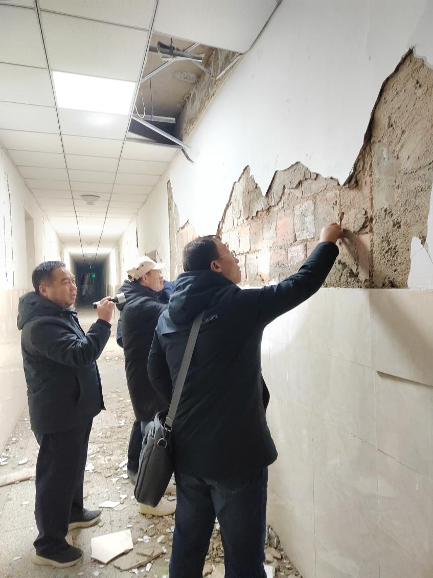 積石山縣海拔高、天氣冷、西風烈。集團公司派出的技術專家發(fā)揮各自專業(yè)技術特長,到達災區(qū)即開展受災房屋安全排查工作。95個專家小組重點對災區(qū)學校、醫(yī)院、污水處理廠、供熱站、福利院、賓館以及水利工程、居民住宅進行詳細排查,認真出具評估結果,確保讓群眾住到安全的房屋里。