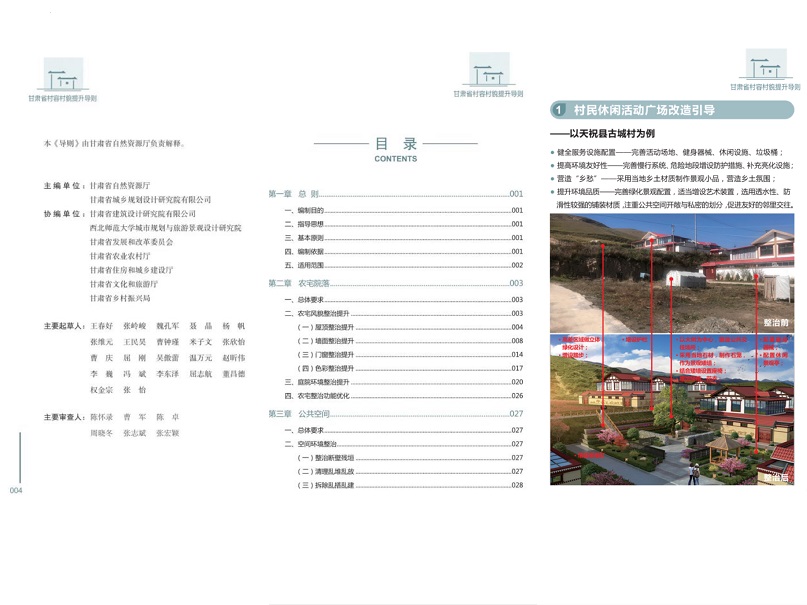 《導則》成果分為提升指引和示例圖集兩部分。提升指引部分以文字形式明確了甘肅省村容村貌整治提升的要求和內容,包括總則、農宅院落、公共空間、道路街巷、綠化美化、環境衛生、村落保護、保障機制和附錄等9個章節,對全省5個國家級歷史文化名村和54個傳統村落實行特殊保護;示例圖集部分以圖文形式提出了村容村貌提升的多種、可選處理方法和典型案例,主要包括農宅院落、公共空間、道路街巷、綠化美化、環境衛生、村落保護等6部分內容。