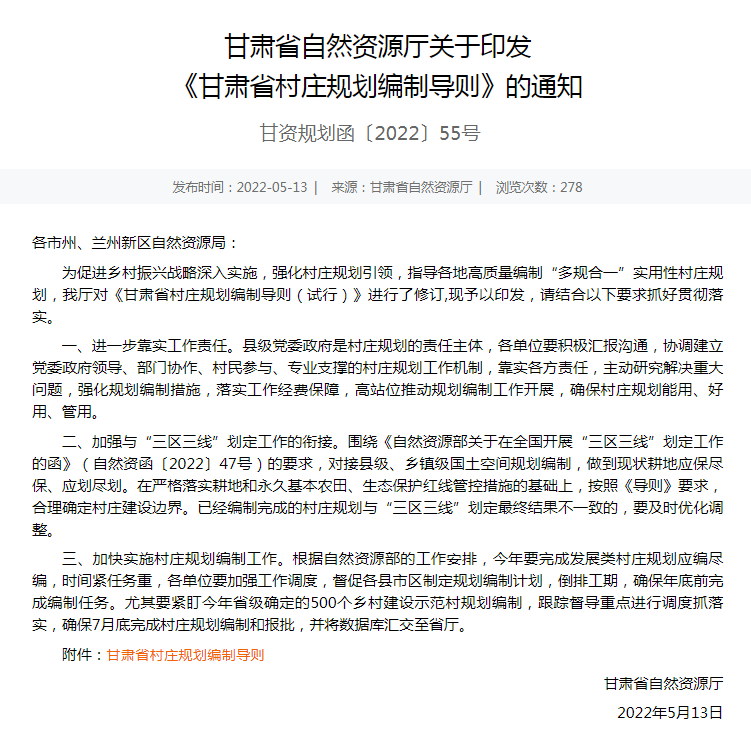 為深入貫徹習近平總書記視察甘肅重要講話和指示精神,落實省委、省政府關于村莊規劃工作部署,促推鄉村振興戰略深入實施,指導各地高質量編制“多規合一”實用性村莊規劃。近日,由甘肅省自然資源廳牽頭組織,甘肅省城鄉規劃設計研究院有限公司參與起草的《甘肅省村莊規劃編制導則》正式印發實施。