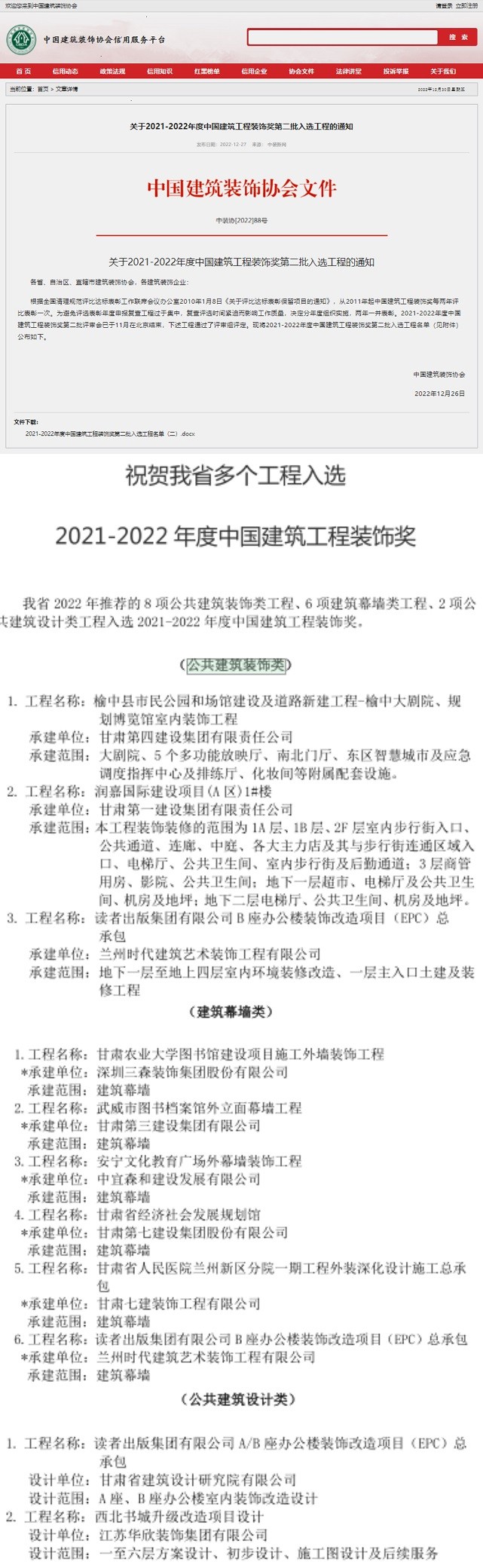 日前,2022年中國建筑工程裝飾獎(jiǎng)評選結(jié)果揭曉,甘肅省建筑設(shè)計(jì)研究院有限公司多個(gè)項(xiàng)目榜上有名。其中,“甘肅省建筑設(shè)計(jì)研究院有限公司辦公樓消防改造及辦公環(huán)境提升改造項(xiàng)目”榮獲公共建筑裝飾類獎(jiǎng)項(xiàng);“讀者出版集團(tuán)有限公司A/B座辦公樓裝飾改造項(xiàng)目”分別榮獲建筑幕墻類、公共建筑裝飾類和公共建筑設(shè)計(jì)類3項(xiàng)獎(jiǎng)項(xiàng)。值得一提的是,建筑設(shè)計(jì)院子公司蘭州時(shí)代建筑藝術(shù)裝飾工程有限公司在此次獲獎(jiǎng)中接連斬獲了3個(gè)獎(jiǎng)項(xiàng)。截至目前,該公司已經(jīng)累計(jì)獲得7項(xiàng)中國建筑工程裝飾獎(jiǎng)獎(jiǎng)項(xiàng)。