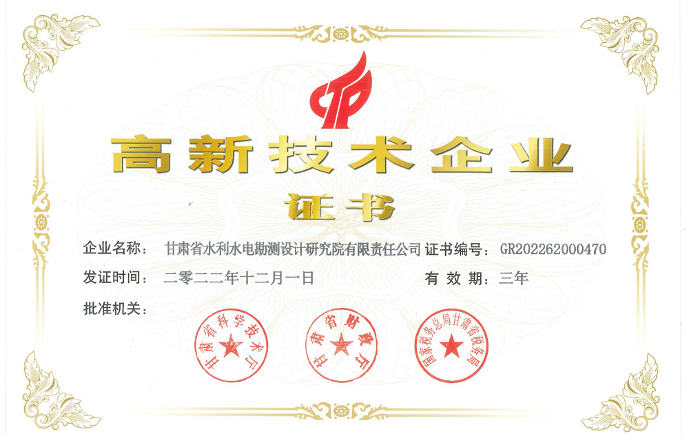 日前,甘肅省水利水電勘測設計研究院有限責任公司獲得甘肅省科技廳、甘肅省財政廳、國家稅務總局甘肅省稅務局聯(lián)合頒發(fā)的“高新技術企業(yè)證書”(證書編號:GR202262000470),標志著水電設計院正式邁入國家高新技術企業(yè)行列,是企業(yè)發(fā)展的又一個重要里程碑。